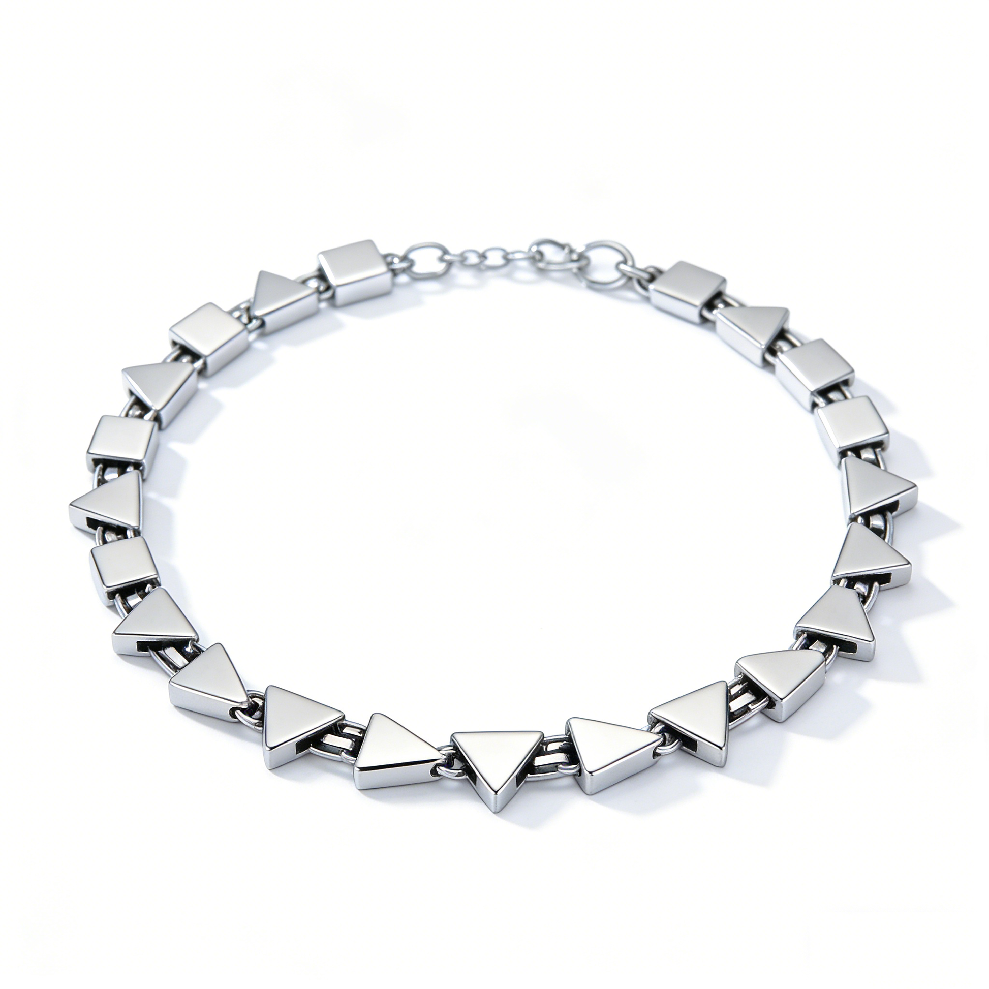 This striking choker combines contemporary geometry with timeless elegance. Featuring an intricate patchwork of triangles and squares in polished silver, it creates a bold yet refined statement piece. The geometric design offers visual interest while maintaining a sleek, minimalist aesthetic that complements both casual and formal wardrobes. Perfect for those who appreciate modern jewelry with artistic flair, this choker sits gracefully at the neckline and serves as an instant conversation starter.