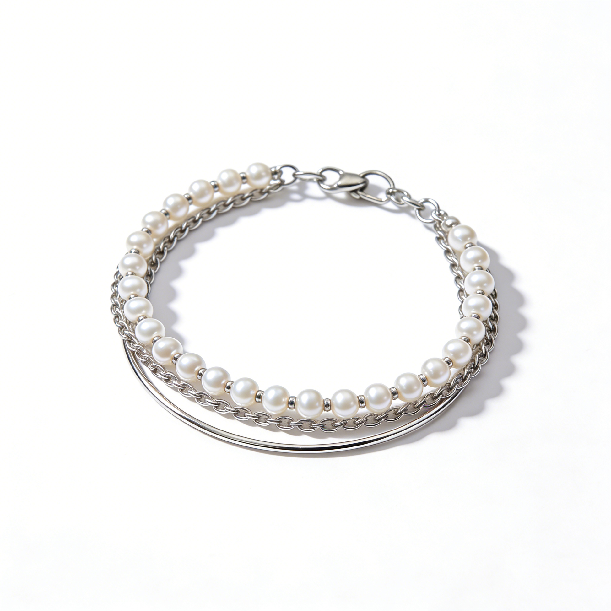 Multi-layer Pearl Metal Chain Layered Silver Bracelet